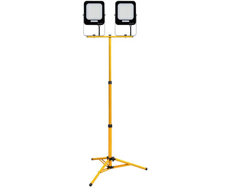 Tripé de iluminação com dois focos LED de 30 W cada, oferecendo uma potência total de 60 W e um fluxo luminoso de 5400 lúmenes.